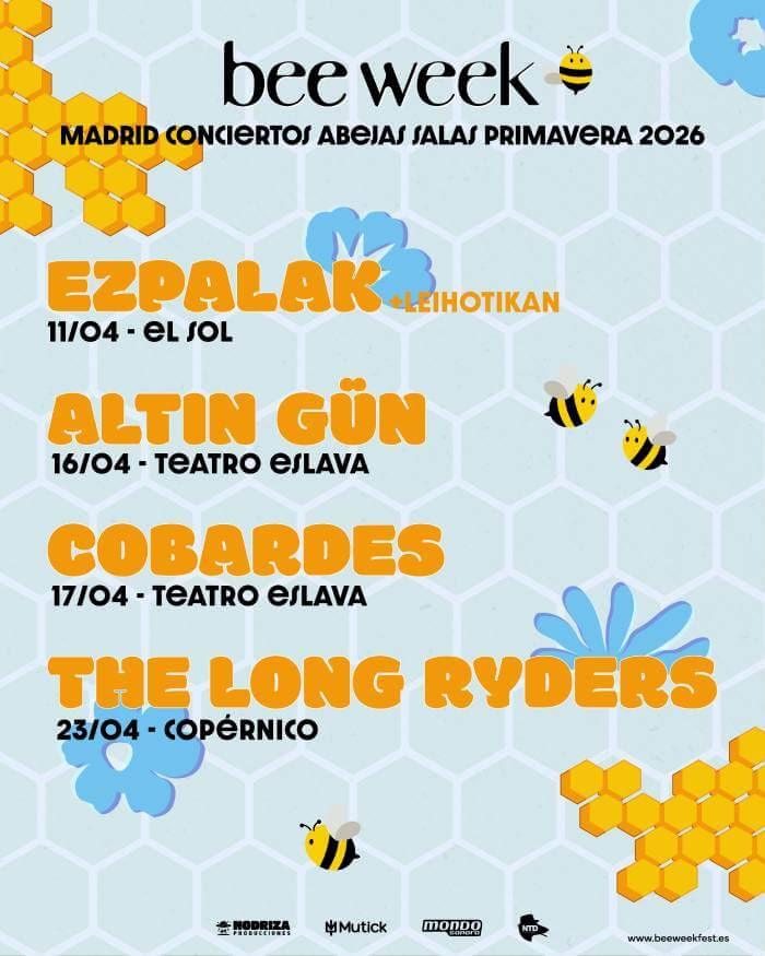 El ciclo de conciertos Bee Week añade nuevos nombres a la programación de su próxima edición en 2026. La cita capitalina aunará música, cultura, sostenibilidad y acción ecológica real durante los meses de febrero, marzo y abril en distintas salas. Por los escenarios de los reconocidos locales pasarán artistas de múltiples géneros, unos consagrados y otros por descubrir entre el gran público, lo que hace que la propuesta sea atractiva a la par que interesante, tanto cultural como musicalmente. Ciclo al que tenemos un gran cariño y que sin duda un año más luchará por polinizarnos con ganas de buena música. Hoy regresan con nuevas confirmaciones  Ezpalak y Leihotikan (El Sol) para el sábado 11 de abril, Altin Gün (Teatro Eslava) el jueves 16 de abril, Cobardes (Teatro Eslava) el viernes 17 de abril y The Long Ryders (Copérnico) el jueves 23 de abril.