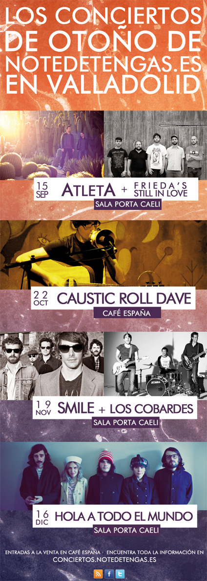 El verano se va, se acaba el tiempo de festivales multitudinarios y volvemos a necesitar tener cerca una oferta musical independiente que nos ayude a sobrellevar la entrada del otoño. Por ello, Notedetengas, vuelve con más fuerza que nunca con su nuevo ciclo de conciertos, tras haber realizado con bastante éxtito el ciclo en el primer semestre de 2011 en varias salas de Valladolid. Como siempre, tratamos de acercar a nuestra ciudad, que cada vez goza de una mayor inquietud musical, a los más recientes y destacados grupos del panorama independiente.