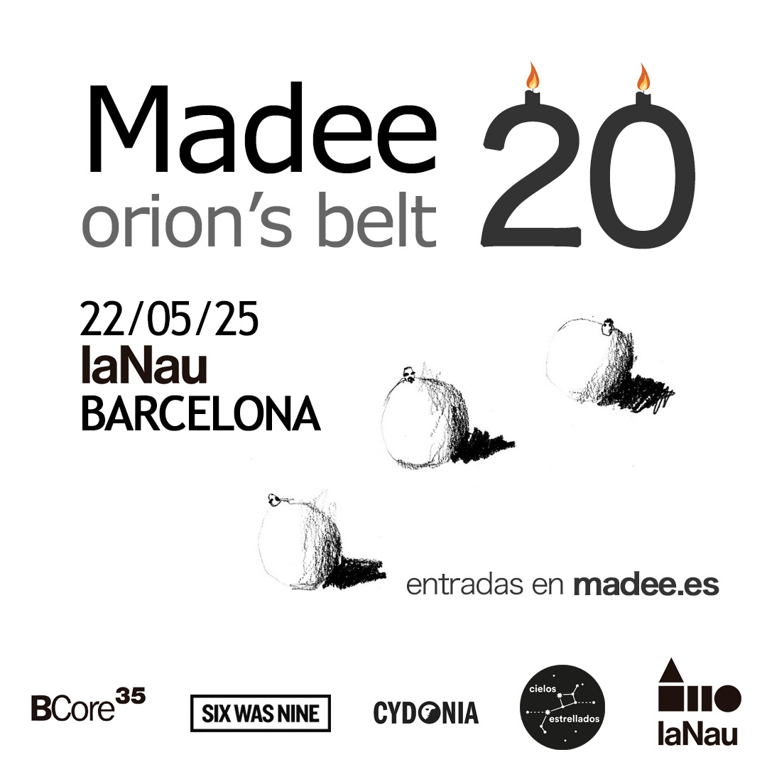 ´Hace veinte años conseguimos plasmar por primera vez en una grabación las canciones que siempre quisimos escribir. “Orion’s Belt” es un disco que trata sobre aprender a conocerse e intentar ser mejor, perder el miedo al fracaso, superar las pérdidas y recuperar la esperanza. También es un disco que nos resultó muy difícil de completar. Algunos de nosotros sufrimos grandes cambios personales que acabaron plasmados en el tono y los textos del disco. Con los anteriores álbumes tuvimos la sensación de que nos faltaba algo, por eso decidimos irnos con Santi Garcia a los estudios Engine de Chicago. Antes de partir intentamos componer y recopilar el mejor material posible, incluso grabamos dos veces el disco, la primera en nuestro local para llegar a Estados Unidos con el repertorio engrasado y bien aprendido. Las sesiones en Engine fueron un éxito, jamás habíamos tocado tan compenetrados, trabajar por primera vez con Santi Garcia nos ayudó a tocar mejor juntos. Todo fue muy intenso, incluso dos de nosotros acabamos ingresados en un hospital de Chicago, true story. El 26 de octubre de 2004 publicamos “Orion’s Belt” a través de los sellos Bcore y Cydonia (nuestro propio sello). Lo presentamos en un precioso concierto que organizamos en la mítica -y desaparecida- sala L’Espai de Barcelona, aquel fue uno de los mejores momentos de nuestra historia. Desde entonces, hemos editado cuatro discos más. Madee es un grupo que ha tenido muchos tiempos muertos debido a las agendas, trabajos, obligaciones y vidas de cada uno, eso nos ha llevado a publicar discos con menos frecuencia de la deseada. Algo que intentamos compensar recientemente publicando y encadenando nuestros tres últimos discos entre 2020 y 2023. El pasado verano nos reunimos y estuvimos hablando de la posibilidad de hacer algo con motivo del 20º aniversario de «Orion’s Belt”, decidimos juntarnos de nuevo para celebrar las canciones más importantes de nuestra banda. En esta nueva aventura; a Capi, Pep, Ramón, Marc y Adam nos acompaña a la batería nuestro viejo amigo Marc Prim (Seek ‘Em All, Soul Aside, Sargon). El concierto del 22 de mayo en La Nau forma parte de las celebraciones del 35º aniversario de BCore, el sello barcelonés que publicó los siete elepés de Madee. Six Was Nine -nuestra agencia de booking- se encarga de organizar los conciertos del 20º aniversario de “Orion’s Belt”. Puedes encontrar las entradas del concierto en nuestra web www.madee.es.’