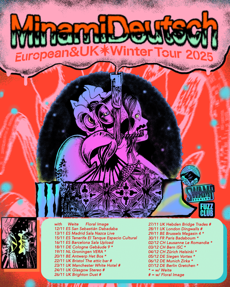 Surgidos de la vibrante explosión psicodélica nipona que dio luz a los añorados Kikagaku Moyo, Minami Deutsch acercan la magia de pioneros del motorik como Can, Neu! o Harmonia a una nueva generación. La banda vuelve a nuestro país a seguir deleitando a los amantes del krautrock y los sonidos psicodélicos con una gira de 4 fechas en la que compartirán cartel con los franceses Brama en Madrid y Barcelona.