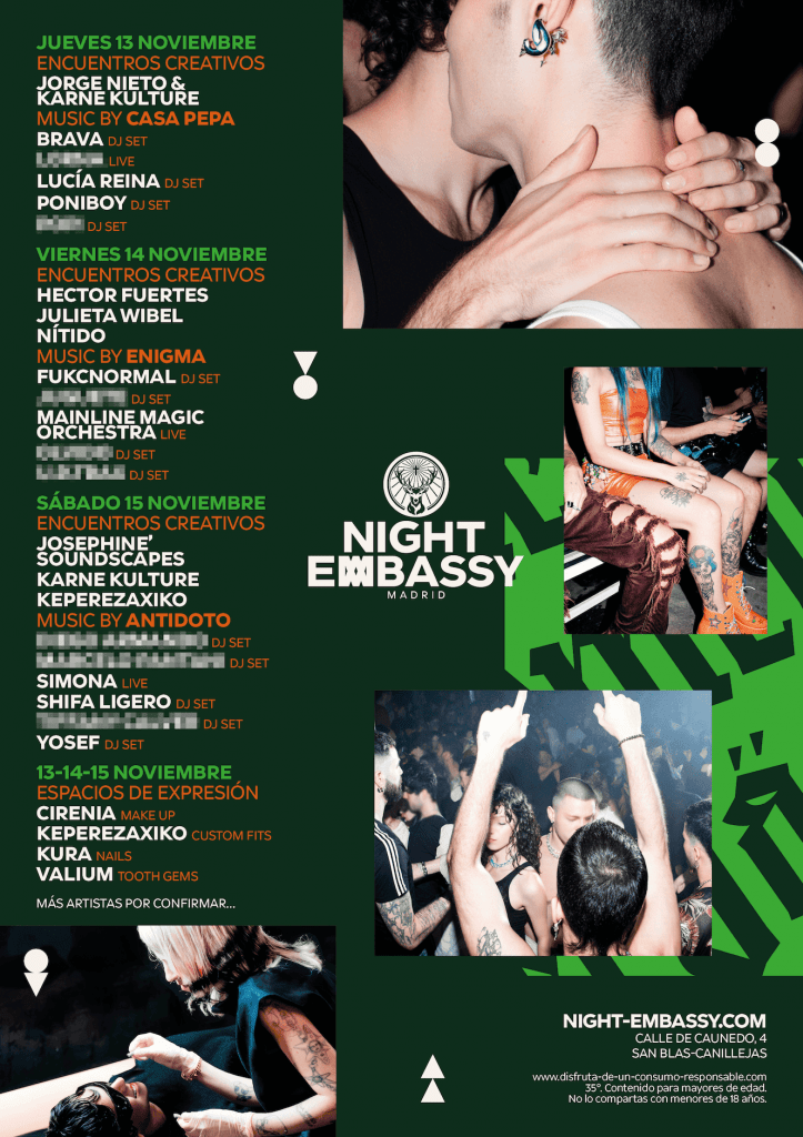 Creado junto a artistas, colectivos y creativos, el programa celebra la experimentación, la autoexpresión y la diversidad, poniendo en el centro el talento local de la escena. Sesiones de baile, espacios de reflexión y encuentros de libertad creativa se entrelazan en una experiencia única, como lo es la noche de Madrid, donde cada persona pueda mostrarse sin filtros y ser libre de, simplemente, ser quien es. Para ello, la seguridad y el respeto son parte del ADN de Night Embassy: un protocolo específico y un servicio de protección en colaboración con SafeNow garantizará que el ocio se viva de manera segura e inclusiva.